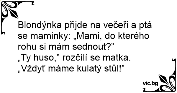 Blondýnka přijde na večeři a ptá se maminky: „Mami, do kterého rohu si mám sednout?”