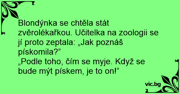 Blondýnka se chtěla stát zvěrolékařkou. Učitelka na zoologii se jí proto zeptala: „Jak poznáš pískomila?”