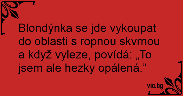Blondýnka se jde vykoupat do oblasti s ropnou skvrnou a když vyleze, povídá: „To jsem ale hezky opálená.”