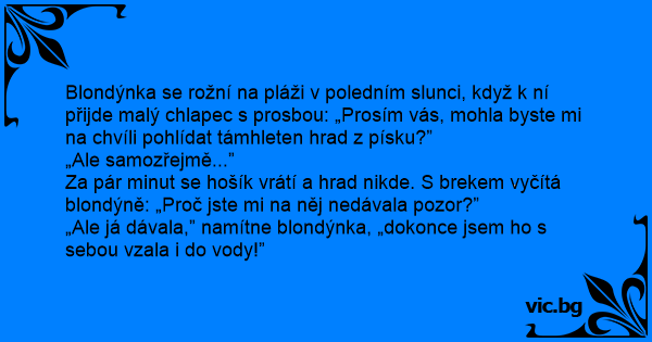 Blondýnka se rožní na pláži v poledním slunci, když k ní přijde malý chlapec s prosbou: „Prosím vás, mohla byste mi na chvíli pohlídat támhleten hrad z písku?”