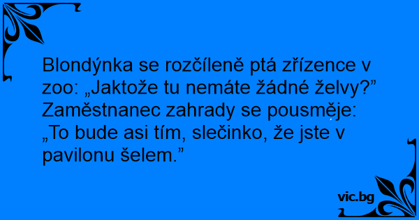 Blondýnka se rozčíleně ptá zřízence v zoo: „Jaktože tu nemáte žádné želvy?”