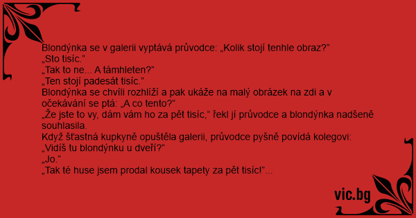 Když šťastná kupkyně opuštěla galerii, průvodce pyšně povídá kolegovi: „Vidíš tu blondýnku u dveří?”