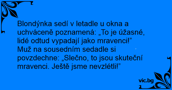 Blondýnka sedí v letadle u okna a uchváceně poznamená: „To je úžasné, lidé odtud vypadají jako mravenci!”