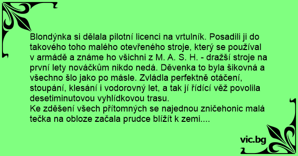Letí dva policajti ve vrtulníku a jeden povídá druhému: „Rozbila se nám klimatizace.” „Jak jsi to poznal?” „Protože pilot se potí a ten velkej větrák nad náma se netočí.” *By Smajlicek* : - )