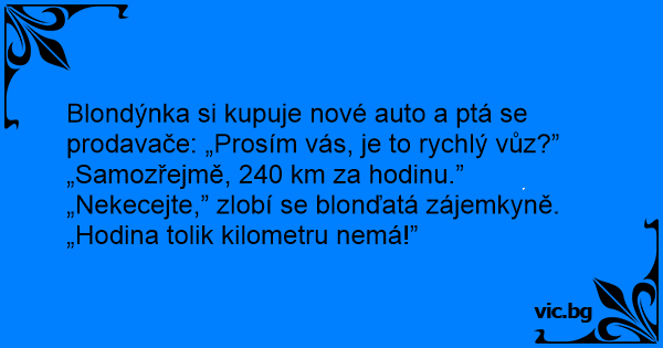 Blondýnka si kupuje nové auto a ptá se prodavače: „Prosím vás, je to rychlý vůz?”