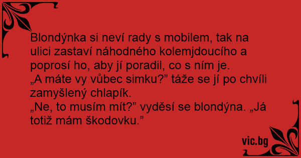 „Ne, to musím mít?” vyděsí se blondýna. „Já totiž mám škodovku.”