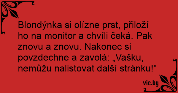 Blondýnka si olízne prst, přiloží hо na monitor a chvíli čeká. Pak znovu a znovu. Nakonec si povzdechne a zavolá: „Vašku, nemůžu nalistovat další stránku!”
