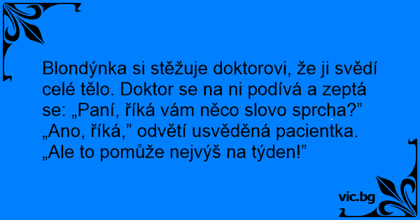 Blondýnka si stěžuje doktorovi, že ji svědí celé tělo. Doktor se na ni podívá a zeptá se: „Paní, říká vám něco slovo sprcha?”