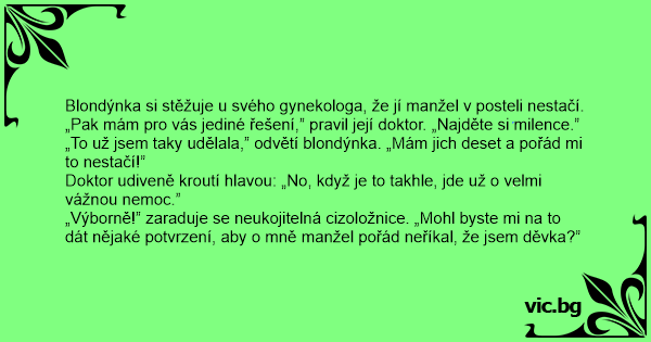 Blondýnka si stěžuje u svého gynekologa, že jí manžel v posteli nestačí.