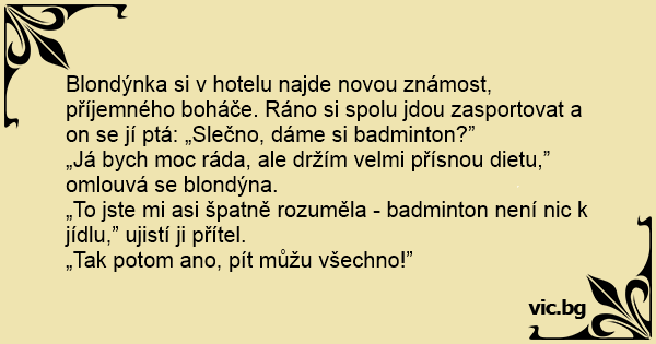 Blondýnka si v hotelu najde novou známost, příjemného boháče. Ráno si spolu jdou zasportovat a on se jí ptá: „Slečno, dáme si badminton?”