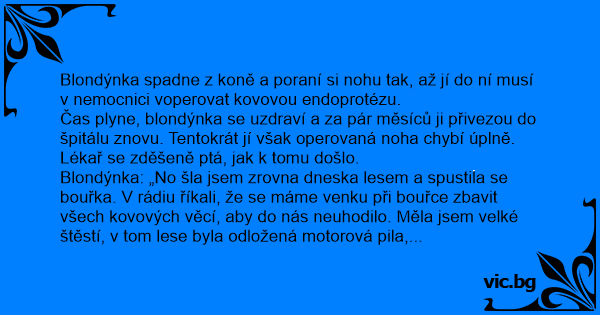 Blondýnka: „No šla jsem zrovna dneska lesem a spustila se bouřka. V rádiu říkali, že se máme venku při bouřce zbavit všech kovových věcí, aby do nás neuhodilo. Měla jsem velké štěstí, v tom lese byla odložená motorová pila, tu jsem vzala a nohu s endoprotézou si pro jistotu odřízla.”