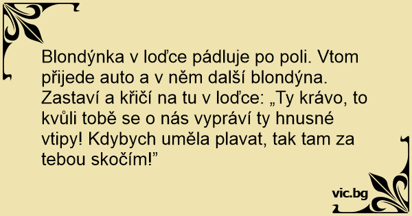 Blondýnka v loďce pádluje po poli. Vtom přijede auto a v něm další blondýna. Zastaví a křičí na tu v loďce: „Ty krávo, to kvůli tobě se o nás vypráví ty hnusné vtipy! Kdybych uměla plavat, tak tam za tebou skočím!”