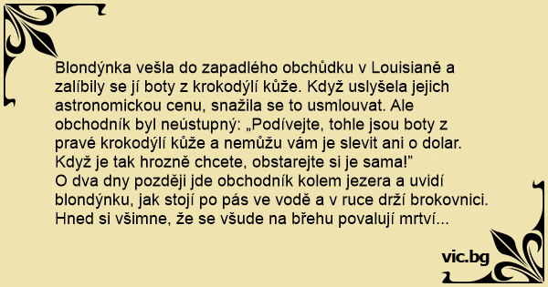 Een blondje loopt voorbij een schoenenwinkel. Daar ziet ze een paar prachtige krokodillenleren schoenen. Ze gaat naar binnen, maar is verbaasd van de prijs die de verkoper noemt. Ze vindt de...