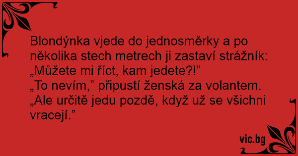 Blondýnka vjede do jednosměrky a po několika stech metrech ji zastaví strážník: „Můžete mi říct, kam jedete?!”