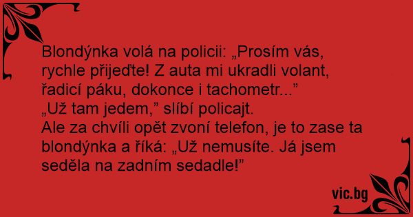 Ale za chvíli opět zvoní telefon, je to zase ta blondýnka a říká: „Už nemusíte. Já jsem seděla na zadním sedadle!”