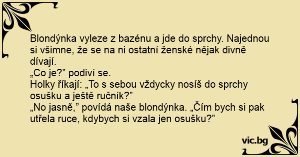 „No jasně,” povídá naše blondýnka. „Čím bych si pak utřela ruce, kdybych si vzala jen osušku?”
