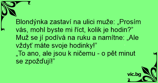 Muž se jí podívá na ruku a namítne: „Ale vždyť máte svoje hodinky!”