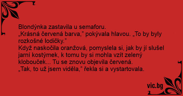 Když naskočila oranžová, pomyslela si, jak by jí slušel jarní kostýmek, k tomu by si mohla vzít zelený klobouček... Tu se znovu objevila červená.