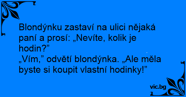 „Vím,” odvětí blondýnka. „Ale měla byste si koupit vlastní hodinky!”