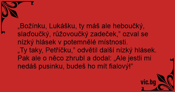 „Ty taky, Petříčku,” odvětil další nízký hlásek. Pak ale o něco zhrubl a dodal: „Ale jestli mi nedáš pusinku, budeš hо mít fialový!”