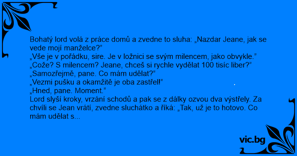 Bohatý lord volá z práce domů a zvedne to sluha: „Nazdar Jeane, jak se vede mojí manželce?”