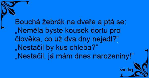 Bouchá žebrák na dveře a ptá se: „Neměla byste kousek dortu pro člověka, co už dva dny nejedl?”