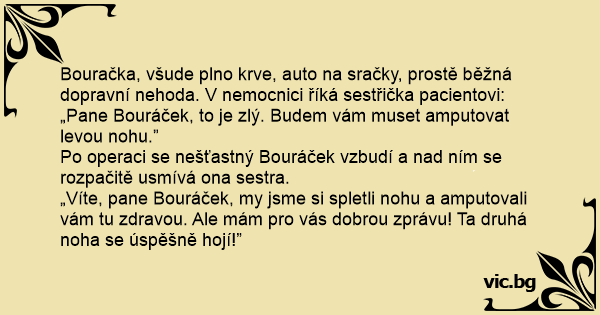 Bouračka, všude plno krve, auto na sračky, prostě běžná dopravní nehoda. V nemocnici říká sestřička pacientovi: „Pane Bouráček, to je zlý. Budem vám muset amputovat levou nohu.”