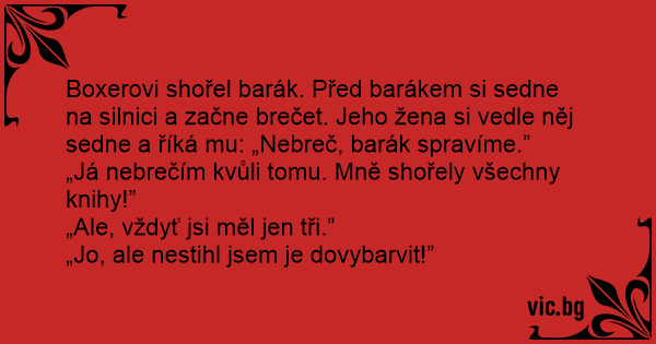 Boxerovi shořel barák. Před barákem si sedne na silnici a začne brečet. Jeho žena si vedle něj sedne a říká mu: „Nebreč, barák spravíme.”