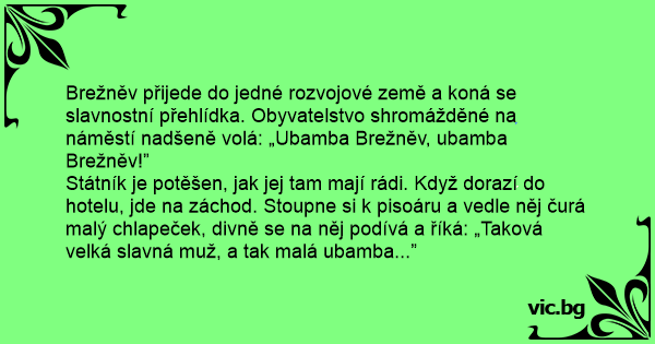 Státník je potěšen, jak jej tam mají rádi. Když dorazí do hotelu, jde na záchod. Stoupne si k pisoáru a vedle něj čurá malý chlapeček, divně se na něj podívá a říká: „Taková velká slavná muž, a tak malá ubamba...”