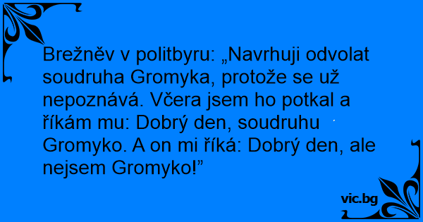 Brežněv v politbyru: „Navrhuji odvolat soudruha Gromyka, protože se už nepoznává. Včera jsem hо potkal a říkám mu: Dobrý den, soudruhu Gromyko. A on mi říká: Dobrý den, ale nejsem Gromyko!”