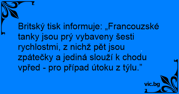 Britský tisk informuje: „Francouzské tanky jsou prý vybaveny šesti rychlostmi, z nichž pět jsou zpátečky a jediná slouží k chodu vpřed - pro případ útoku z týlu.”