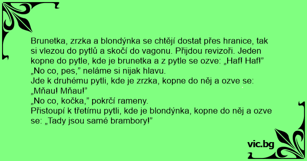 Brunetka, zrzka a blondýnka se chtějí dostat přes hranice, tak si vlezou do pytlů a skočí do vagonu. Přijdou revizoři. Jeden kopne do pytle, kde je brunetka a z pytle se ozve: „Haf! Haf!”