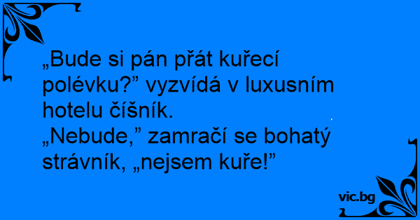 „Bude si pán přát kuřecí polévku?” vyzvídá v luxusním hotelu číšník.