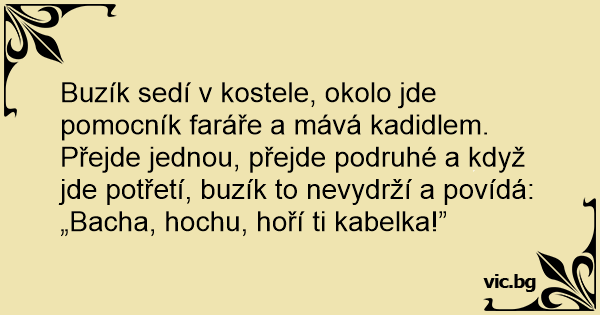 Buzík sedí v kostele, okolo jde pomocník faráře a mává kadidlem. Přejde jednou, přejde podruhé a když jde potřetí, buzík to nevydrží a povídá: „Bacha, hochu, hoří ti kabelka!”