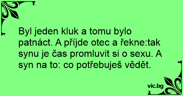 Byl jeden kluk a tomu bylo patnáct. A příjde otec a řekne:tak synu je čas promluvit si o sexu. A syn na to: co potřebuješ vědět.
