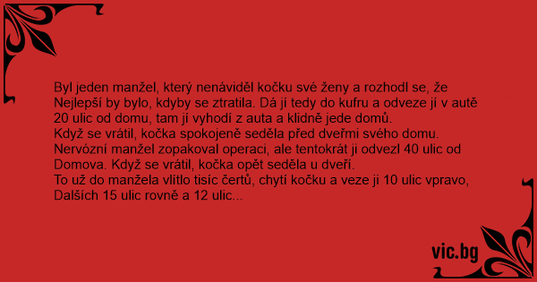 To už do manžela vlítlo tisíc čertů, chytí kočku a veze ji 10 ulic vpravo,