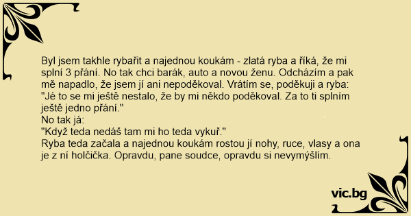 Byl jsem takhle rybařit a najednou koukám - zlatá ryba a říká, že mi splní 3 přání. No tak chci barák, auto a novou ženu. Odcházím a pak mě napadlo, že jsem jí ani nepoděkoval. Vrátím se, poděkuji a ryba: