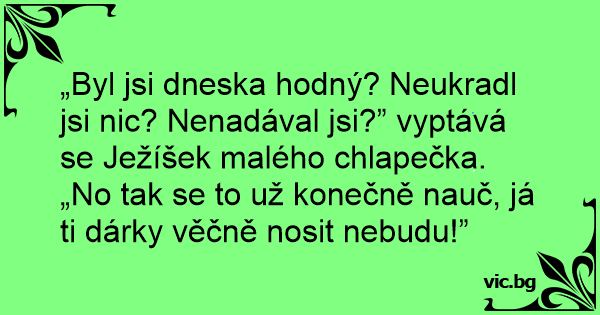 „Byl jsi dneska hodný? Neukradl jsi nic? Nenadával jsi?” vyptává se Ježíšek malého chlapečka. „No tak se to už konečně nauč, já ti dárky věčně nosit nebudu!”