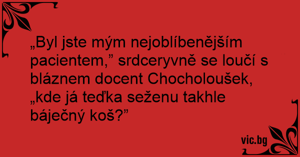 „Byl jste mým nejoblíbenějším pacientem,” srdceryvně se loučí s bláznem docent Chocholoušek, „kde já teďka seženu takhle báječný koš?”