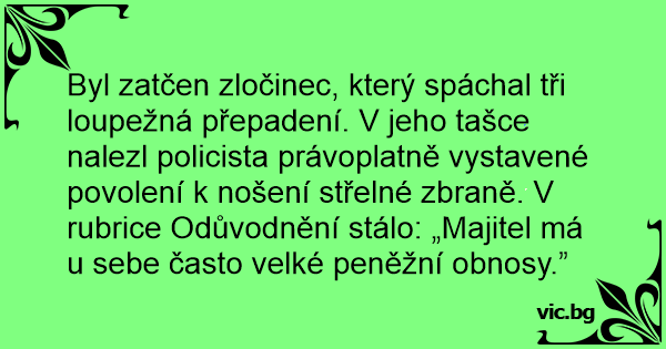 Byl zatčen zločinec, který spáchal tři loupežná přepadení. V jeho tašce nalezl policista právoplatně vystavené povolení k nošení střelné zbraně. V rubrice Odůvodnění stálo: „Majitel má u sebe často velké peněžní obnosy.”