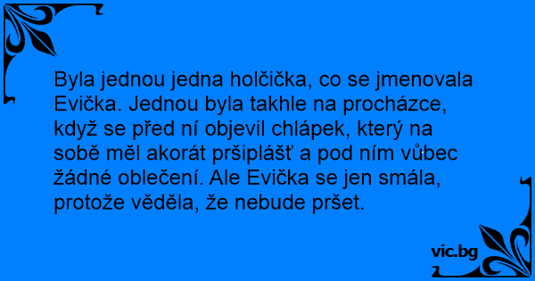 Byla jednou jedna holčička, co se jmenovala Evička. Jednou byla takhle na procházce, když se před ní objevil chlápek, který na sobě měl akorát pršiplášť a pod ním vůbec žádné oblečení. Ale Evička se jen smála, protože věděla, že nebude pršet.