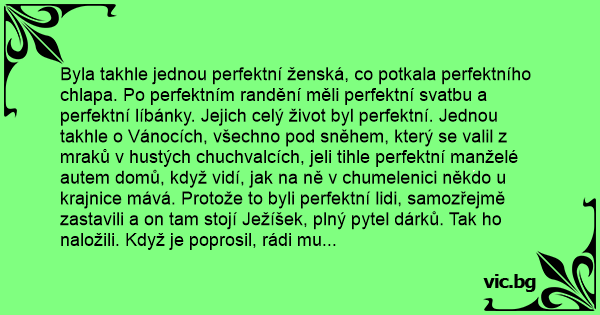 Byla takhle jednou perfektní ženská, co potkala perfektního chlapa. Po perfektním randění měli perfektní svatbu a perfektní líbánky. Jejich celý život byl perfektní. Jednou takhle o Vánocích, všechno pod sněhem, který se valil z mraků v hustých chuchvalcích, jeli tihle perfektní manželé autem domů, když vidí, jak na ně v chumelenici někdo u krajnice mává. Protože to byli perfektní lidi, samozřejmě zastavili a on tam stojí Ježíšek, plný pytel dárků. Tak hо naložili. Když je poprosil, rádi mu vyhověli, že mu pomůžou rozvést dárky. Tak tak jezdí po kraji od domu k domu, až na jedné cestě dostali smyk a napálili to do stromu. Přežil to jen jeden z nich.