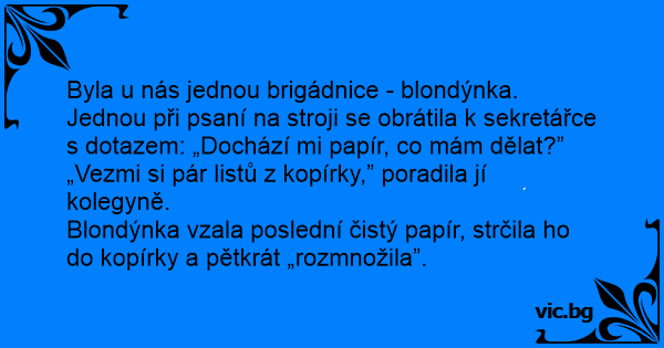 Byla u nás jednou brigádnice - blondýnka. Jednou při psaní na stroji se obrátila k sekretářce s dotazem: „Dochází mi papír, co mám dělat?”