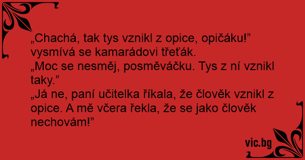 „Chachá, tak tys vznikl z opice, opičáku!” vysmívá se kamarádovi třeťák.