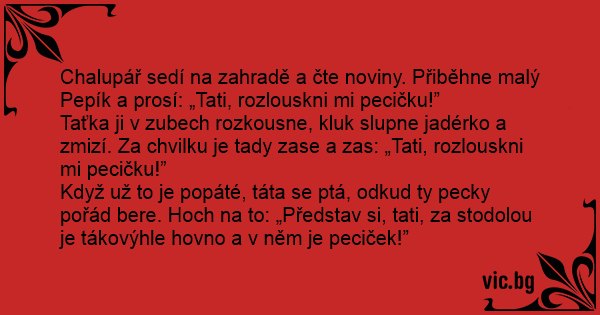 Chalupář sedí na zahradě a čte noviny. Přiběhne malý Pepík a prosí: „Tati, rozlouskni mi pecičku!”