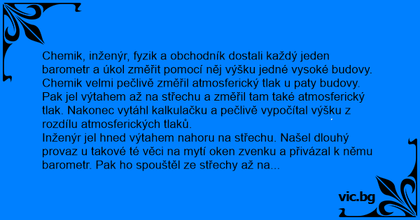 Chemik velmi pečlivě změřil atmosferický tlak u paty budovy. Pak jel výtahem až na střechu a změřil tam také atmosferický tlak. Nakonec vytáhl kalkulačku a pečlivě vypočítal výšku z rozdílu atmosferických tlaků.