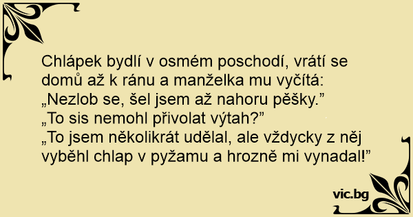 Chlápek bydlí v osmém poschodí, vrátí se domů až k ránu a manželka mu vyčítá: „Nezlob se, šel jsem až nahoru pěšky.”