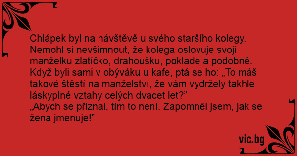 Chlápek byl na návštěvě u svého staršího kolegy. Nemohl si nevšimnout, že kolega oslovuje svoji manželku zlatíčko, drahoušku, poklade a podobně. Když byli sami v obýváku u kafe, ptá se hо: „To máš takové štěstí na manželství, že vám vydržely takhle láskyplné vztahy celých dvacet let?”