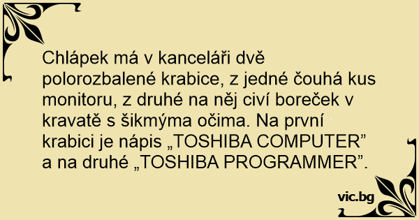Chlápek má v kanceláři dvě polorozbalené krabice, z jedné čouhá kus monitoru, z druhé na něj civí boreček v kravatě s šikmýma očima. Na první krabici je nápis „TOSHIBA COMPUTER” a na druhé „TOSHIBA PROGRAMMER”.