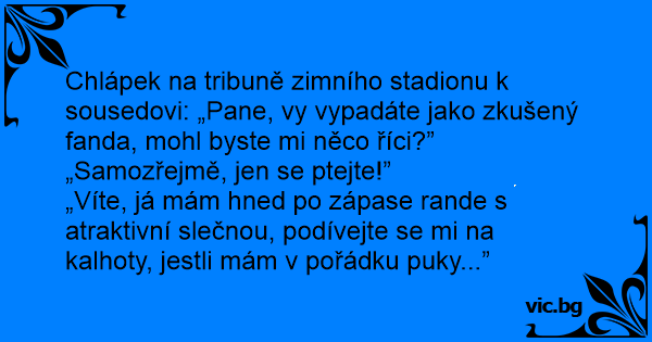 Chlápek na tribuně zimního stadionu k sousedovi: „Pane, vy vypadáte jako zkušený fanda, mohl byste mi něco říci?”